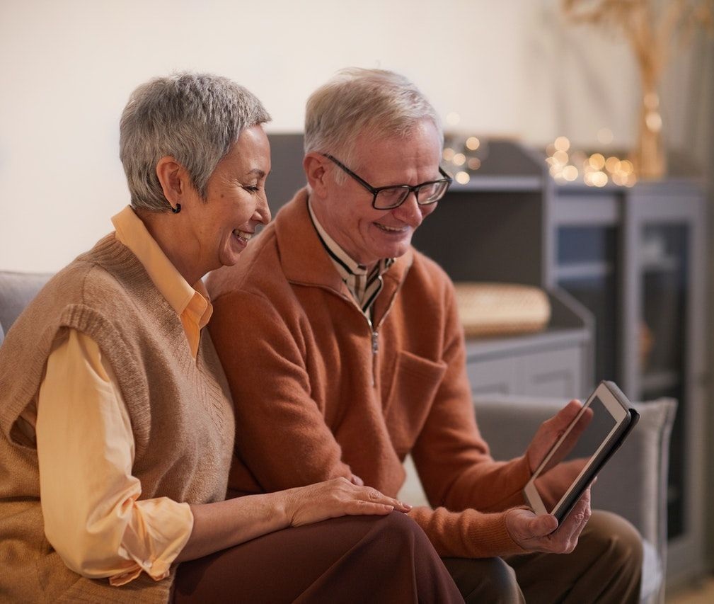 Seniorenpaar sitzt auf dem Sofa und hält ein Tablet in Händen